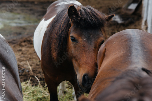 © Andrii, Fototapeta premium Curious domestic ponies on the ranch look out from behind the fence. Agriculture and animal husbandry
