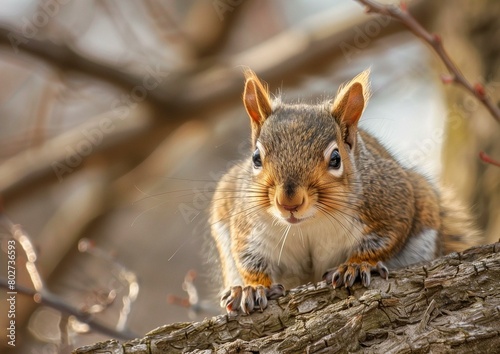 © Qstock, Obraz premium Curious Eastern Gray Squirrel Peering from Tree Branch in Sunlit Forest.