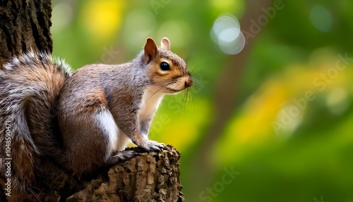 © Sadaqat, Obraz premium Curious Eastern Gray Squirrel Perched on a Tree Stump