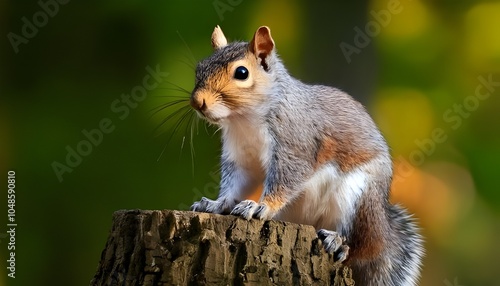 © Sadaqat, Fototapeta premium Curious Eastern Gray Squirrel Perched on a Tree Stump