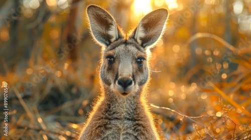 Fototapeta premium Curious eastern grey kangaroo is illuminated by the warm light of the setting...