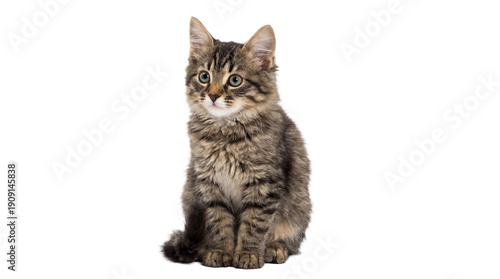 © Irene, Obraz premium curious fluffy tabby kitten sitting, facing forward with bright eyes, isolated on a transparent background for versatile design use in pet content.