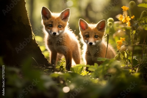 Obraz premium Curious fox cubs in a sunlit woodland