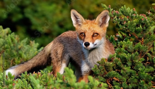 Naklejka premium Curious Fox Emerges from Shadows A Moment of Wild Wonder amidst Autumnal Forest Hues, at