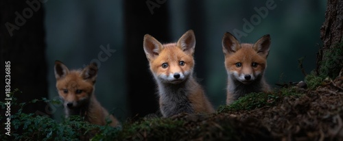 © ckybe, Obraz premium Curious fox kits checking out the woodland ground early in the morning light