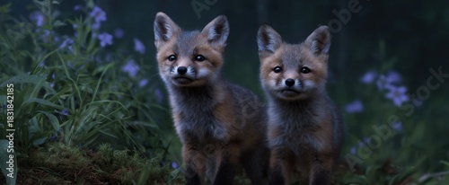 © ckybe, Obraz premium Curious fox kits investigate the forest floor during early dawn.