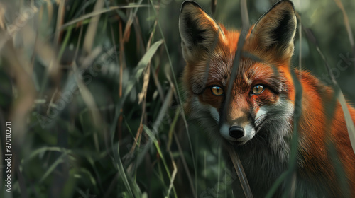 © Flash Studios, Obraz premium Curious Fox Peeking Through Tall Grasses Illustration