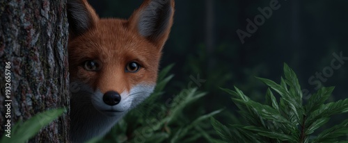 © ckybe, Fototapeta premium Curious fox peeks from behind a tree in a dense forest setting.
