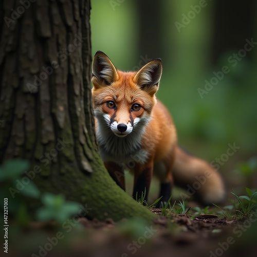 Fototapeta premium Curious fox peering from behind a tree, wild forest, nature exploration,...