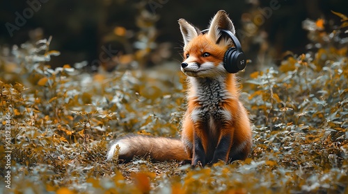 © Bussakon, Obraz premium Curious fox sitting in autumn leaves wearing headphones