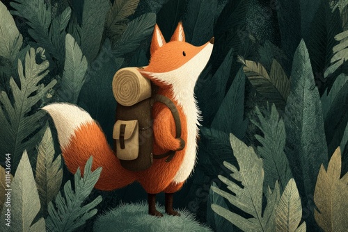 Naklejka premium Curious fox wearing an old backpack and rolling mat exploring dense green...