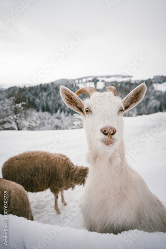 © Екатерина Криворучко, Obraz premium Curious Goat in Snowy Winter Landscape Near Rustic Barn and Forest