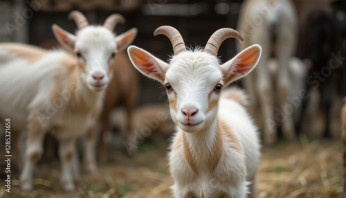 © Khawar, Obraz premium Curious Goats in Barnyard Setting