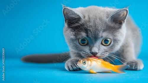 © Benjarin, Naklejka premium Curious gray kitten interacts with vibrant goldfish on blue background