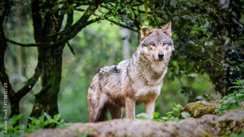 © Willy Mobilo, Fototapeta premium Curious gray wolf prowling in the forest