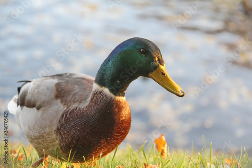 © OlegOs, Fototapeta premium Curious grey duck with green head