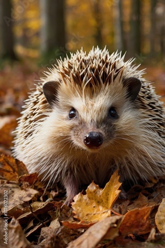 © Nemanja, Fototapeta premium Curious hedgehog on autumn leaves looking at camera