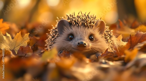© Keattipoom, Fototapeta premium Curious Hedgehog Surprised Behind Pile of Leaves - Funny and Cute Animal Photorealistic Image