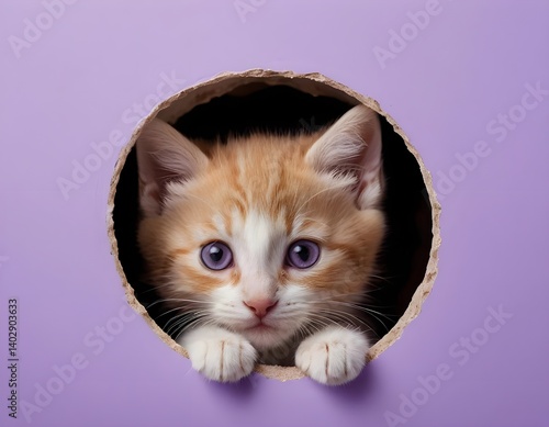 © Teeranan, Naklejka premium Curious Kitten Peeking Through Hole in Purple Background