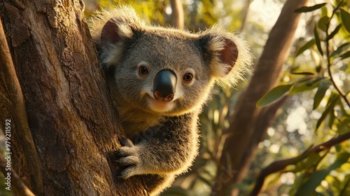 © sknab, Obraz premium Curious Koala Descending Eucalyptus Tree in Lush Forest Habitat - Capturing Textured Fur and Agile Movement