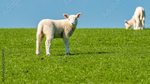 Obraz premium Curious lamb on a meadow looking into the camera