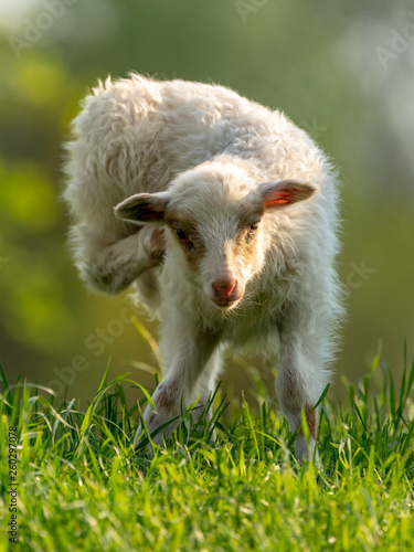 Obraz premium Curious lamb on a meadow looking into the camera
