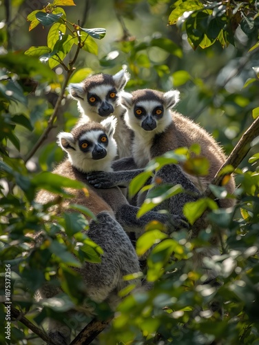 © Aleksandr, Obraz premium Curious lemurs playfully interacting amidst lush green foliage