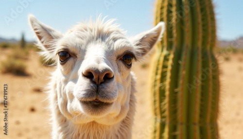 © Dmitry, Obraz premium Curious llama gazing at a cactus in arid desert landscape, nature's wonder