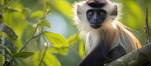 Obraz premium Curious Monkey Observing Surroundings While Perched on Leafy Tree Branch