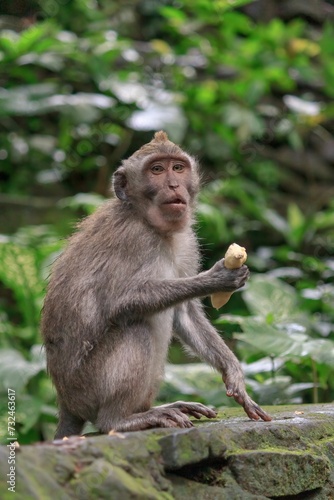 Fototapeta premium Curious monkey perched atop a wall in the lush jungle, enjoying a ripe banana...