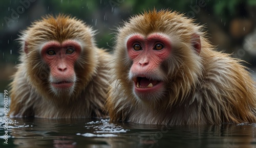 © Василь Тігай, Naklejka premium Curious Monkeys in Rainy Water
