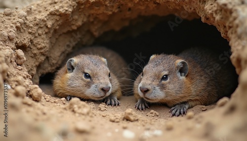 © Yury, Naklejka premium Curious prairie dogs peeking from their burrow against earthy background