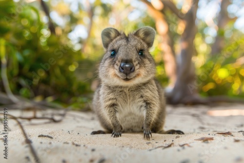 © P, Obraz premium Curious quokka on sandy beach with vibrant greenery in background AI