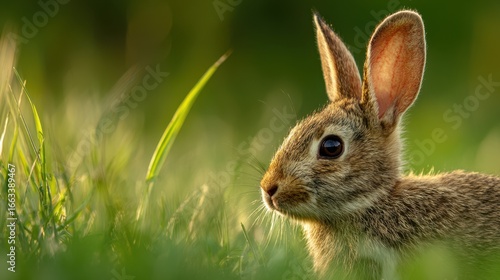 Fototapeta premium Curious rabbit explores a green meadow during sunny spring afternoon