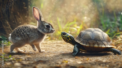 Naklejka premium Curious rabbit looking at a turtle on a sunny day in nature