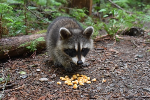 © isz, Fototapeta premium Curious raccoon exploring forest ground for tasty food treats