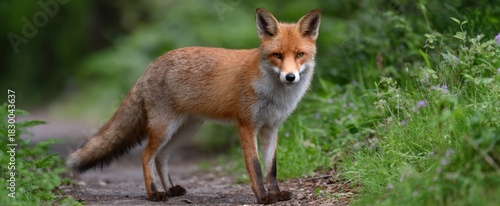 Naklejka premium Curious red fox carefully sniffing fresh scent along a quiet woodland path