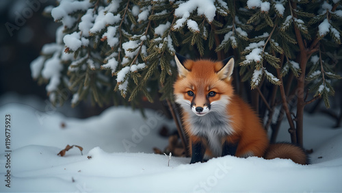 © Irina, Obraz premium Curious Red Fox Kit in Snowy Pine Forest
