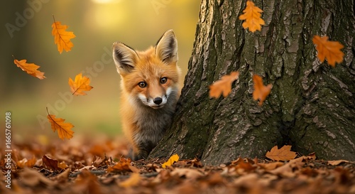 © loxia stock image, Fototapeta premium Curious Red Fox Peeking from Behind a Tree Trunk Amidst Falling Autumn Leaves