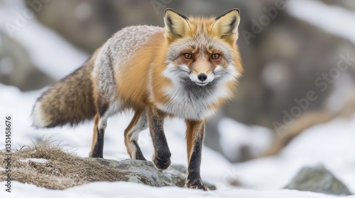 © Zyra, Obraz premium Curious Red Fox Walking Through Snowy Landscape in Forest During Winter Season