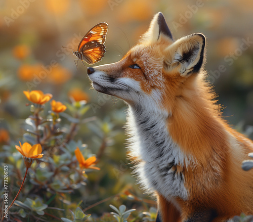 © Гамбит, Fototapeta premium Curious Red Fox with Butterfly on Nose in Golden Hour Light, AI Generation