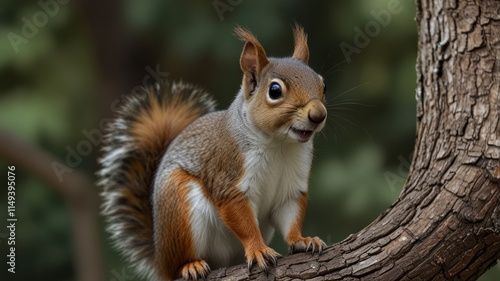 © titik, Obraz premium Curious red squirrel perched on a tree branch.