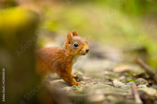 Fototapeta premium Curious red squirrel standing at the forest floor
