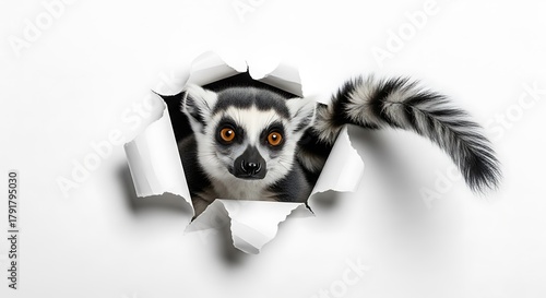 © Bayani, Naklejka premium Curious ring-tailed lemur peeking through torn white paper, its bright orange eyes and striped tail visible.