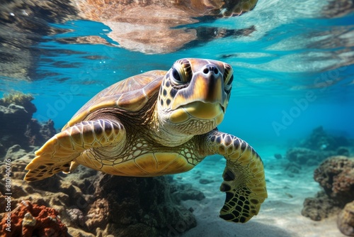 Fototapeta premium Curious sea turtle swimming in blue ocean