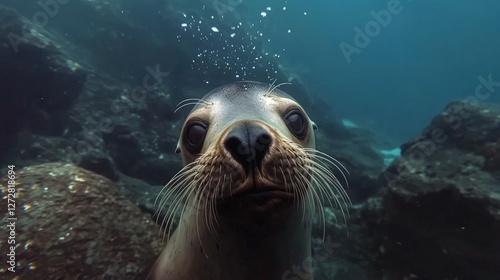 © Kenny, Fototapeta premium Curious sealion underwater with bubbles near rocky landscape