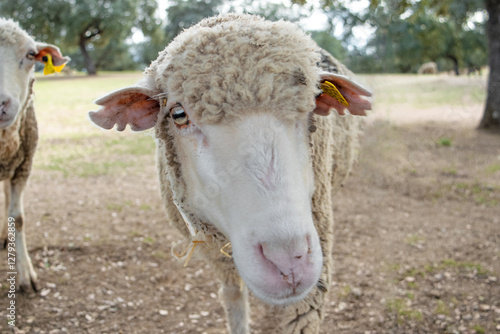 Obraz premium Curious sheep slowly approaches the camera lens, leaving a magnificent close-up.