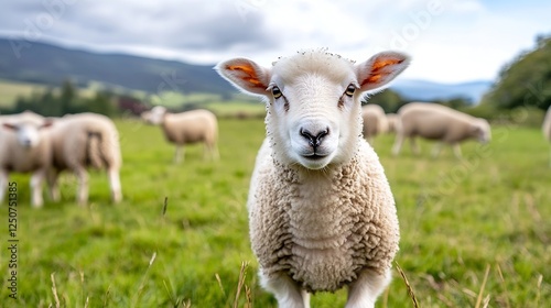© Generative AI, Fototapeta premium Curious sheep standing in a lush green field surrounded by other sheep on a cloudy day : Generative AI