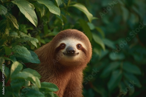 © Andrei, Naklejka premium Curious sloth peeks through lush green foliage, showcasing playf