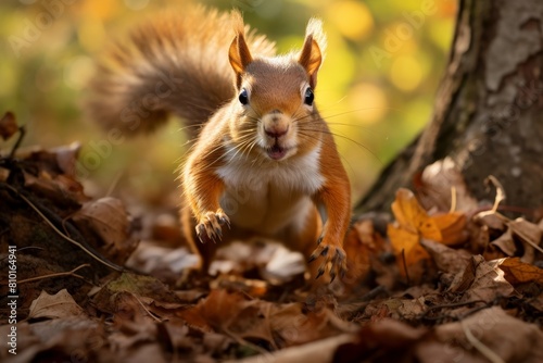 Obraz premium Curious squirrel in autumn leaves